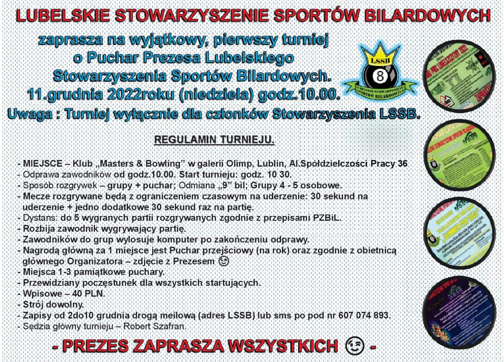 Pierwszy turniej o Puchar Prezesa Stowarzyszenia !!!! 7 grudnia 2022 | Robert Zapraszamy na pierwszy turniej o puchar przechodni Prezesa Lubelskiego Stowarzyszenia Sportów Bilardowych. Szczegóły poniżej.